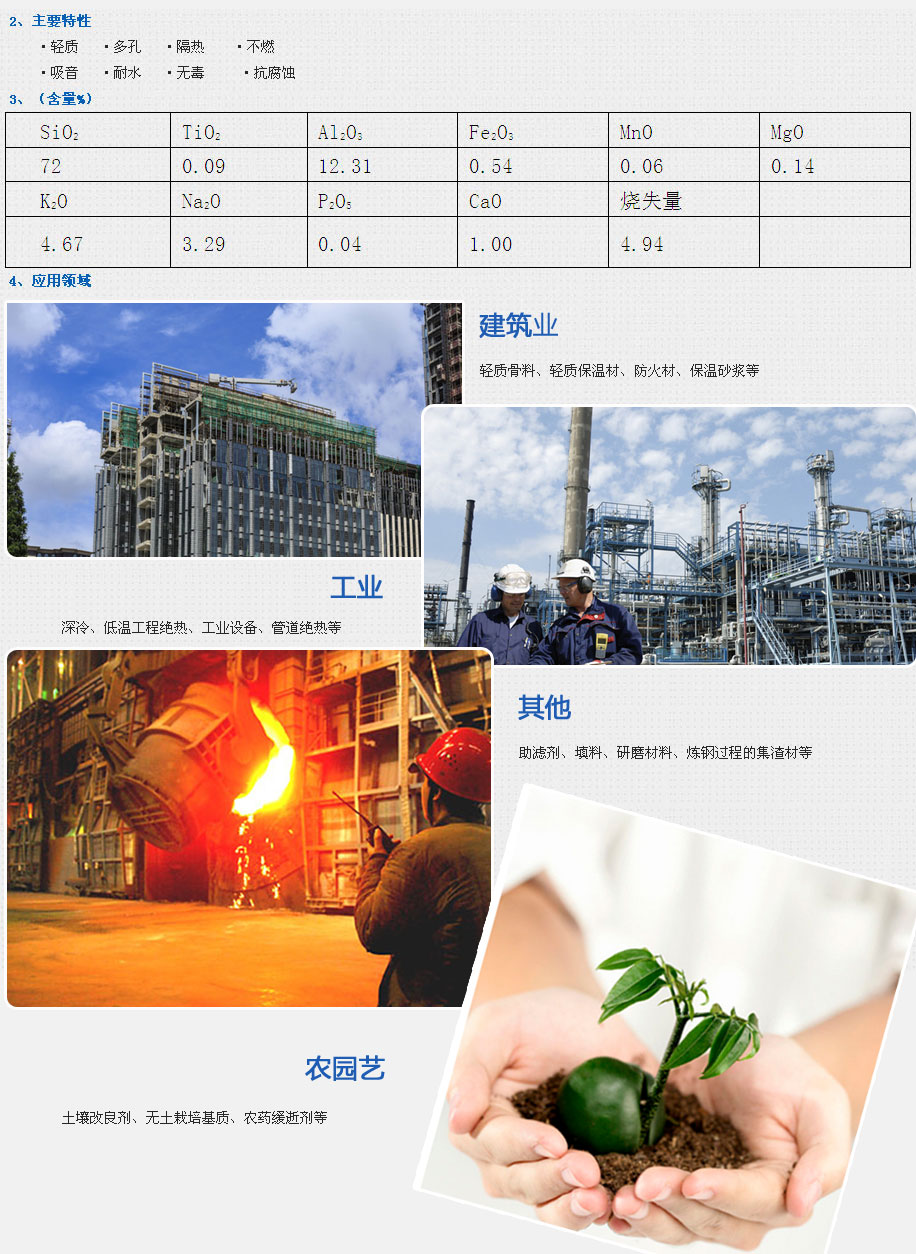 主营:建筑用珍珠岩,油田用珍珠岩,食品用珍珠岩,超低温用珍珠岩